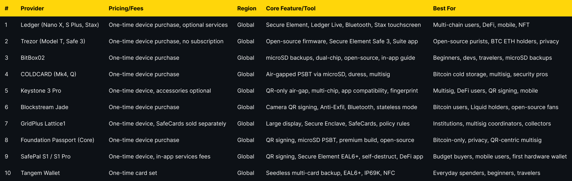 Why Use It: A 5" touchscreen and SafeCards make policy controls and multi-wallet management feel enterprise-grade. The Secure Enclave and card model are great for households, teams, or power users who hate “blind signing.”